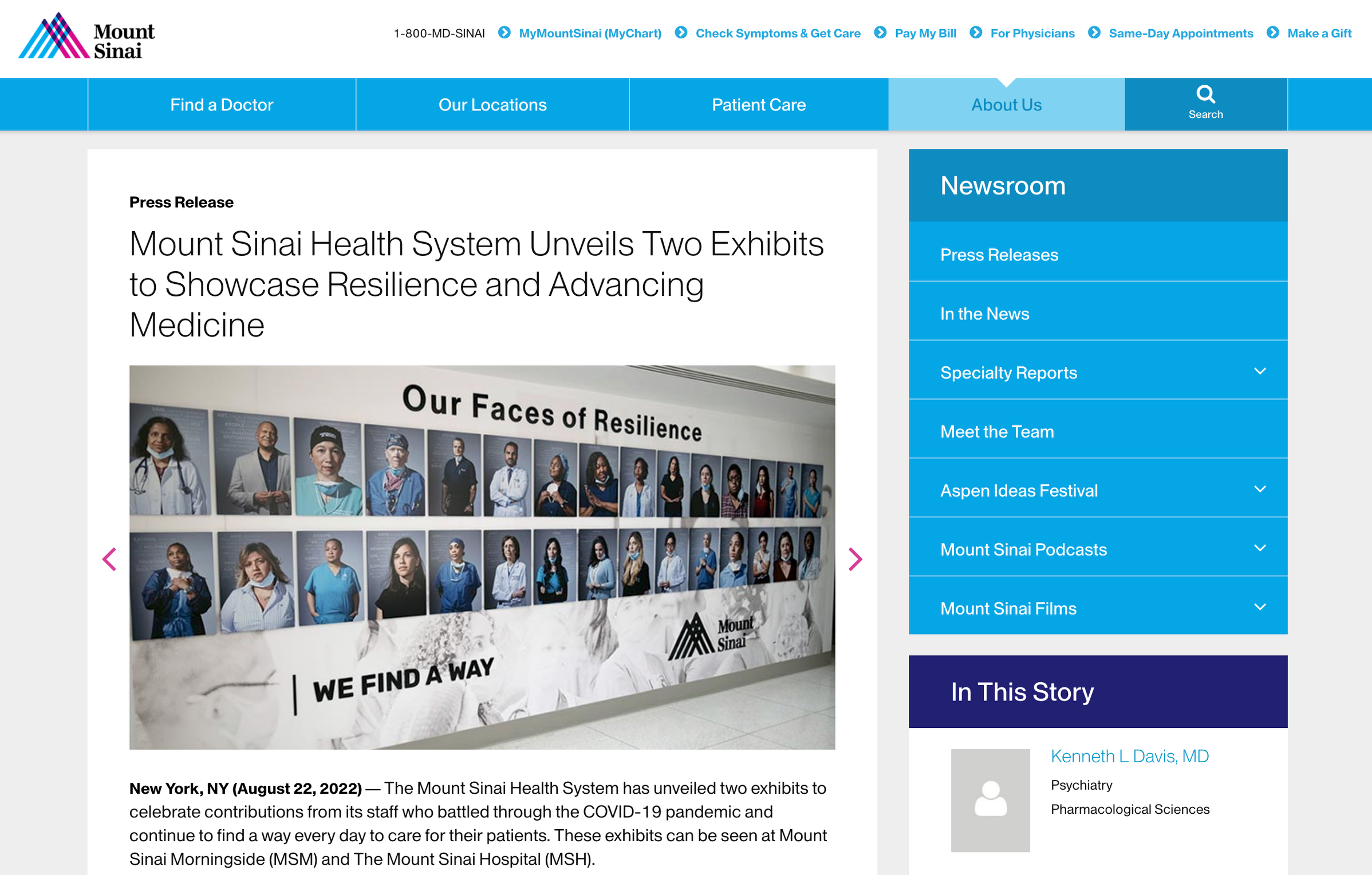 Each photo curated for this exhibit symbolizes resilience within the MSM community while illustrating the teamwork needed to fight the pandemic and inspiring hope and the courage to carry on. Photo subjects within the exhibit include doctors, nurses, and researchers, along with staff who work in patient transport, radiology, engineering, ambulance services, spiritual care, digital and technology, and more to tell their stories through the pandemic but also how and why they continue on taking care of patients. The permanent exhibit can be seen in the main lobby of Mount Sinai Morningside at 1111 Amsterdam Avenue New York, NY 10025.”